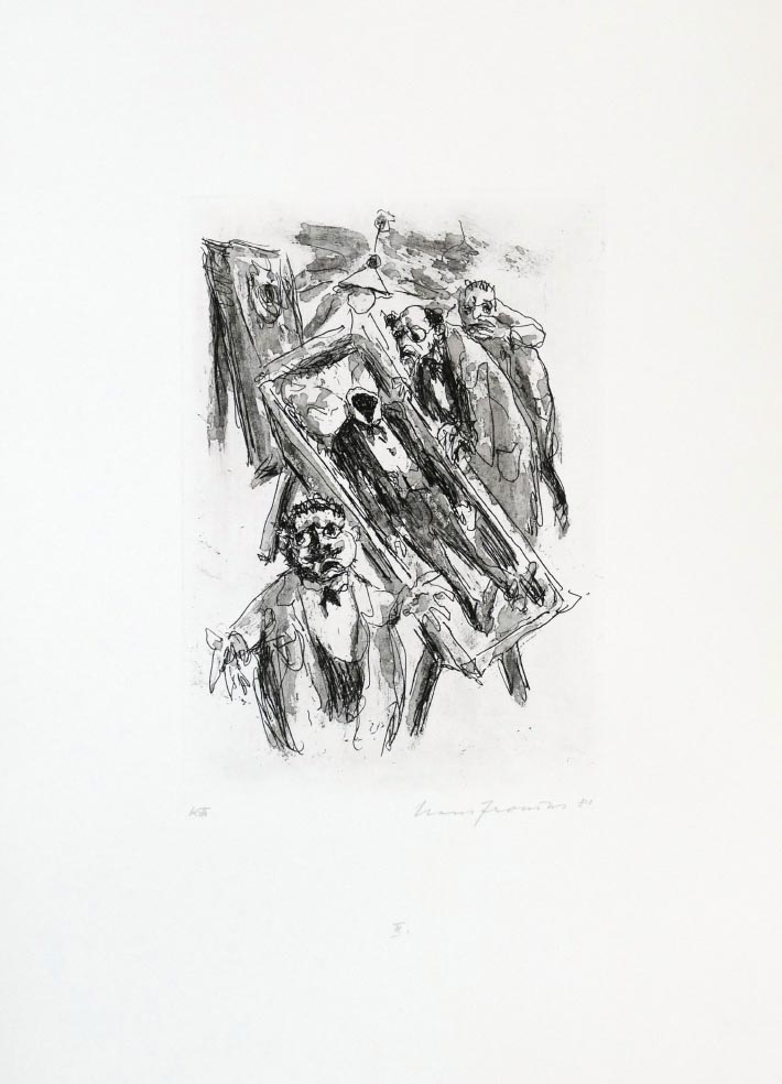| Hans FRONIUS, geboren 12. September 1903 in Sarajevo; verstorben 21. März 1988 in Mödling war ein österreichischer Maler, Graphiker und Illustrator. Sein Leben wurde geprägt durch das Erlebnis, als er als zehnjähriger Augenzeuge des Attentats auf den Thronfolger Franz Ferdinand wurde. Er übersiedelte nach dem Ersten Weltkrieg gemeinsam mit seiner Familie nach Graz. Von 1922 bis 1928 studierte Fronius an der Wiener Akademie. Während dieser Zeit unternahm er mehrere Studienreisen nach Italien, Deutschland, Holland, Dänemark und Frankreich. Sein künstlerisches Vorbild war Alfred Kubin, zu dem Fronius eine enge Freundschaft entwickelte. 1931 nahm er eine Stellung als Kunsterzieher am Realgymnasium in Fürstenfeld/Steiermark an, wo er fast drei Jahrzehnte tätig war. Da er während der Zeit des Austrofaschismus als Sympathisant der Sozialdemokraten galt, war er Repressionen ausgesetzt, so dass er beispielsweise Stundenkürzungen hinnehmen musste. Da er eine Loyalitätserklärung während der nationalsozialistischen Zeit abgab, konnte er unbehelligt weiter malen. Im Jahr 1943 wurde er zur Wehrmacht eingezogen. Nach gemalter versteckter Kritik am Regime musste er in die Schweiz flüchten, von wo er nach dem Krieg wieder heimkehrte. 1961 siedelte Fronius nach Perchtoldsdorf bei Wien um. Nach weiteren drei Jahren im Schuldienst war Fronius ab 1964 als freier Maler tätig. Es folgte eine intensive Schaffensphase, die erst 1988 mit seinem Tod endete. Hans Fronius wurde in einem Ehrengrab am Perchtoldsdorfer Friedhof bestattet. Am Vorplatz des Rathauses von Fürstenfeld wurde in einer Grünanlage ein Gedenkstein errichtet. |